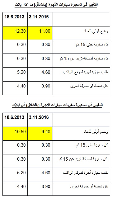 وأخيرا، بعد صراع استهلاكي وبمبادرة من المجلس الإسرائيلي للاستهلاك التي بدأت في شهر نيسان 2015، حُملت بشرى سارة لجمهور المستهلكين: تخفيض أسعار سيارات الأجرة. ابتداء من 3 تِـشْرِين الثاني (نوفمبر) يبدأ الوضع الأولي للعداد من 11 شاقل، وفي إيلات يبدأ العداد من 9.40 شاقل. أما بخصوص باقي الأسعار (سفرية حتى 15 كم، طلب سيارة أجرة، نقل حمولة الخ) لن يطرأ أي تغيير. كما ترون في القوائم المرفقة، الحديث هو عن تخفيض بقيمة 1.30 شاقل من تسعيرة شهر حزيران 2013، أي ما يعادل عشرة بالمئة.