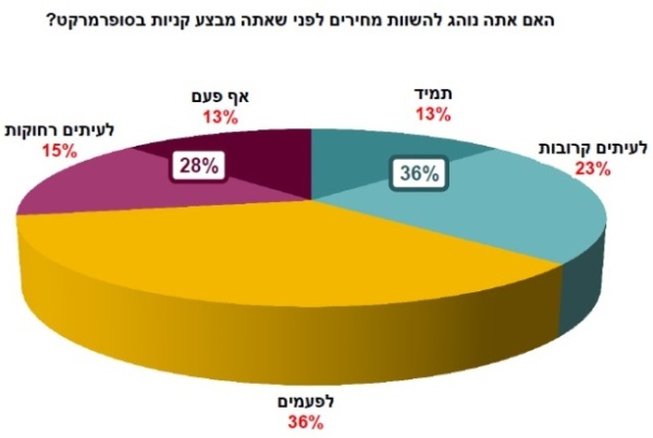 בשאלת השוואת מחירים לפני ביצוע קניות ברשתות מזון ניכר כי כשליש מהצרכנים נוהגים לעשות זאת בתדירות גבוהה, שליש נוהגים לעשות זאת בתדירות בינונית ושליש בתדירות נמוכה או לעולם לא.