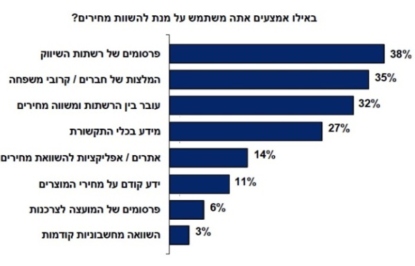 מי שנוהגים להשוות מחירים טרם הקנייה נוהגים לעשות זאת באמצעות 3 דרכים עיקריות: פרסומים של רשתות השיווק, המלצות של חברים או קרובי משפחה ומעבר פיזי בין הרשתות והשוואת המחירים "בשטח".
