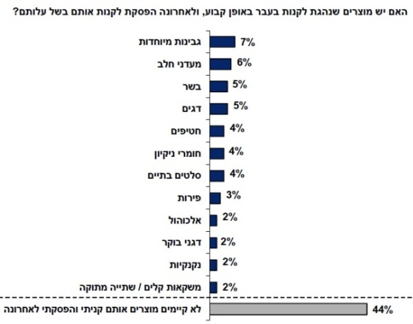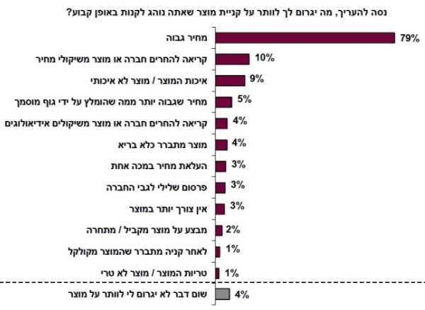 במענה לשאלה מה יגרום להם לוותר על קניית מוצר שהם נוהגים לרכוש, ניכר שמחיר גבוה הינו הסיבה העיקרית, באופן משמעותי, לוויתור על רכישת מוצר שהצרכנים נוהגים לקנות באופן קבוע. מעל למחצית מהנשאלים דיווחו שהפסיקו לקנות לאחרונה מוצר כשלהו משיקולי עלות. מבחינת מודעות הצרכן הישראלי למחאות שהיו לאחרונה שקראו לא לקנות מוצרים שונים בגלל מחירם הגבוה, מרבית מהנשאלים שמעו על המחאות, והמוצרים הזכורים ביותר בהקשר זה הינם מילקי וקוטג'.