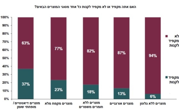 מבחינת הרגלי צריכה של מוצרים מיוחדים, סוג המוצרים שצוין כנצרך בשיעור הגבוה ביותר הינו מוצרים דיאטטיים / מופחתי שומן, וזאת בפער מובהק לעומת שאר המוצרים שנבדקו (מוצרים ללא גלוטן, מוצרים אורגניים, מוצרים ללא חומרים משמרים, מוצרים מקמח מלא). עוד עולה כי מוצרים דיאטטיים ומוצרים מקמח מלא נקנים בשיעורים גבוהים יותר בקרב נשים, וכי קניית כל סוגי המוצרים המיוחדים שנבדקו עולה עם העלייה בגיל ואו בהשכלה.