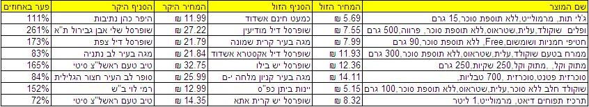 לדוגמא, ופלים שוקולד עלית, ללא תוספת סוכר, 500 גרם יעלו לכם בשופרסל דיל מודיעין ₪ 7.55, אבל בופרסל שלי אבן גבירול ת"א הוא יעלה ₪ 27.22, פער של 261%. סוכרזית פטנט, 700 טבליות, תמצאו במגה בעיר קניון מלחה י-ם במחיר הנמוך ביותר: 14.11, אבל בסופר לב העיר חצור הגלילית היא תעלה לכם ₪ 25.99, פער של 84%. תרכיז תפוחים דיאט של מרמולייט 1 ליטר יעלה לכם ₪ 8.32 ביש קרית אתא, אבל אותו מוצר בדיוק יעלה לכם ₪ 14.35 בטיב טעם ראשל"צ, פער של 72%.